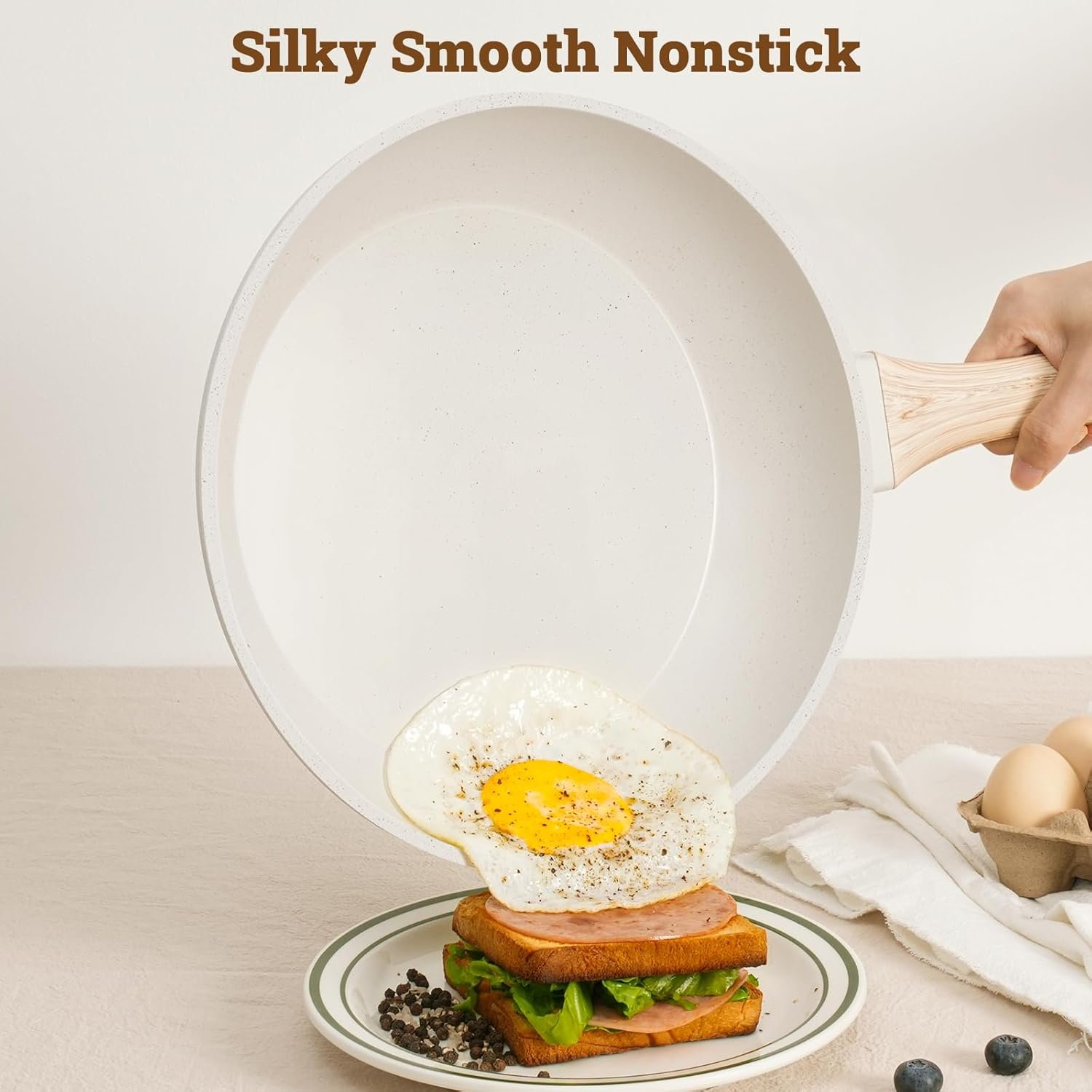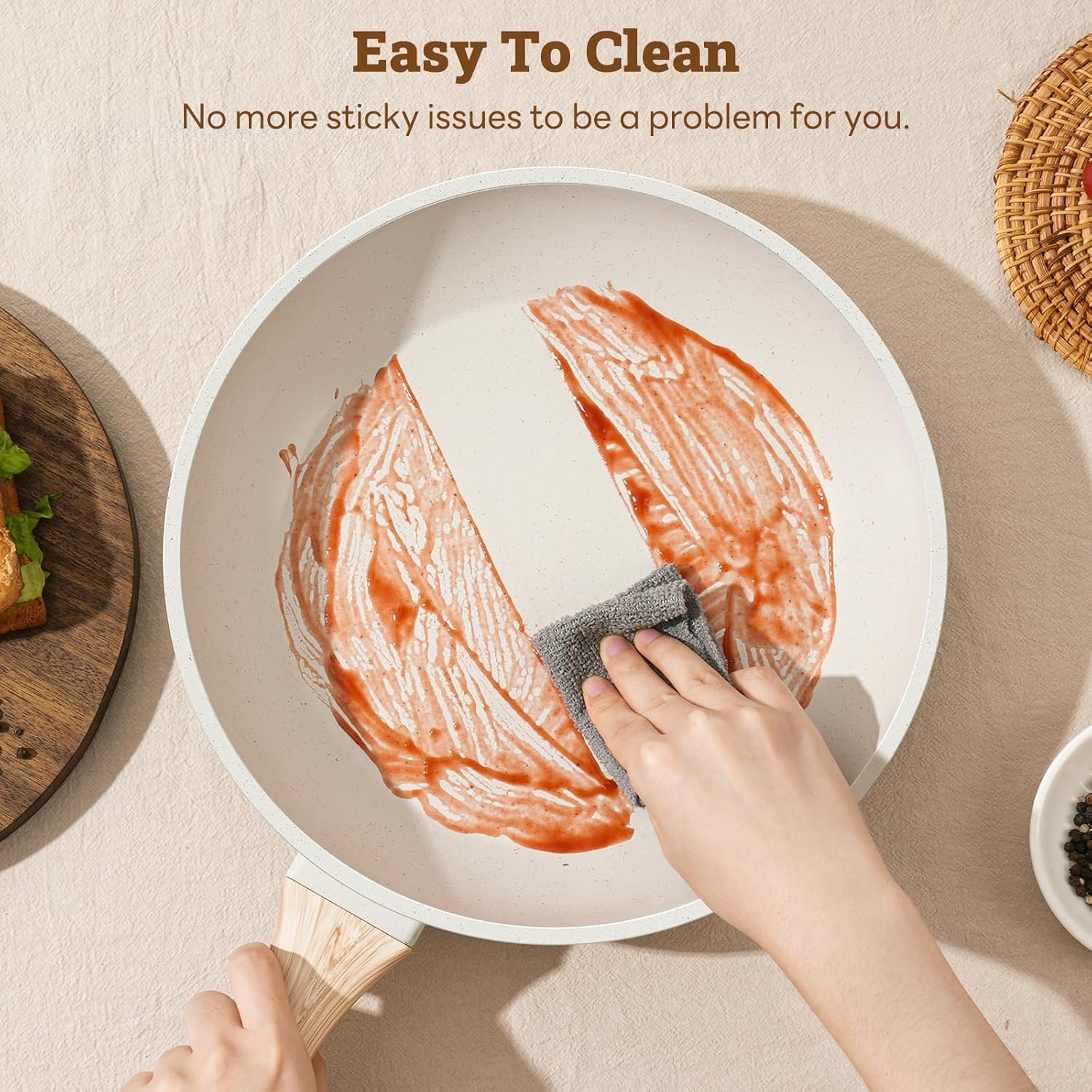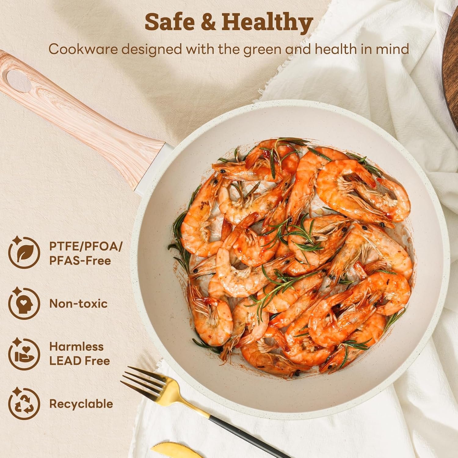 Crafted for induction and all stovetops, these pots and pans heat evenly to deliver perfect results every time. The eco-friendly, toxin-free coating (free from PFAS, PFOA, and PFOS) guarantees safe and healthy meals for your family. The ergonomic wood-look handles stay cool to the touch, offering comfort and style in every dish you prepare.