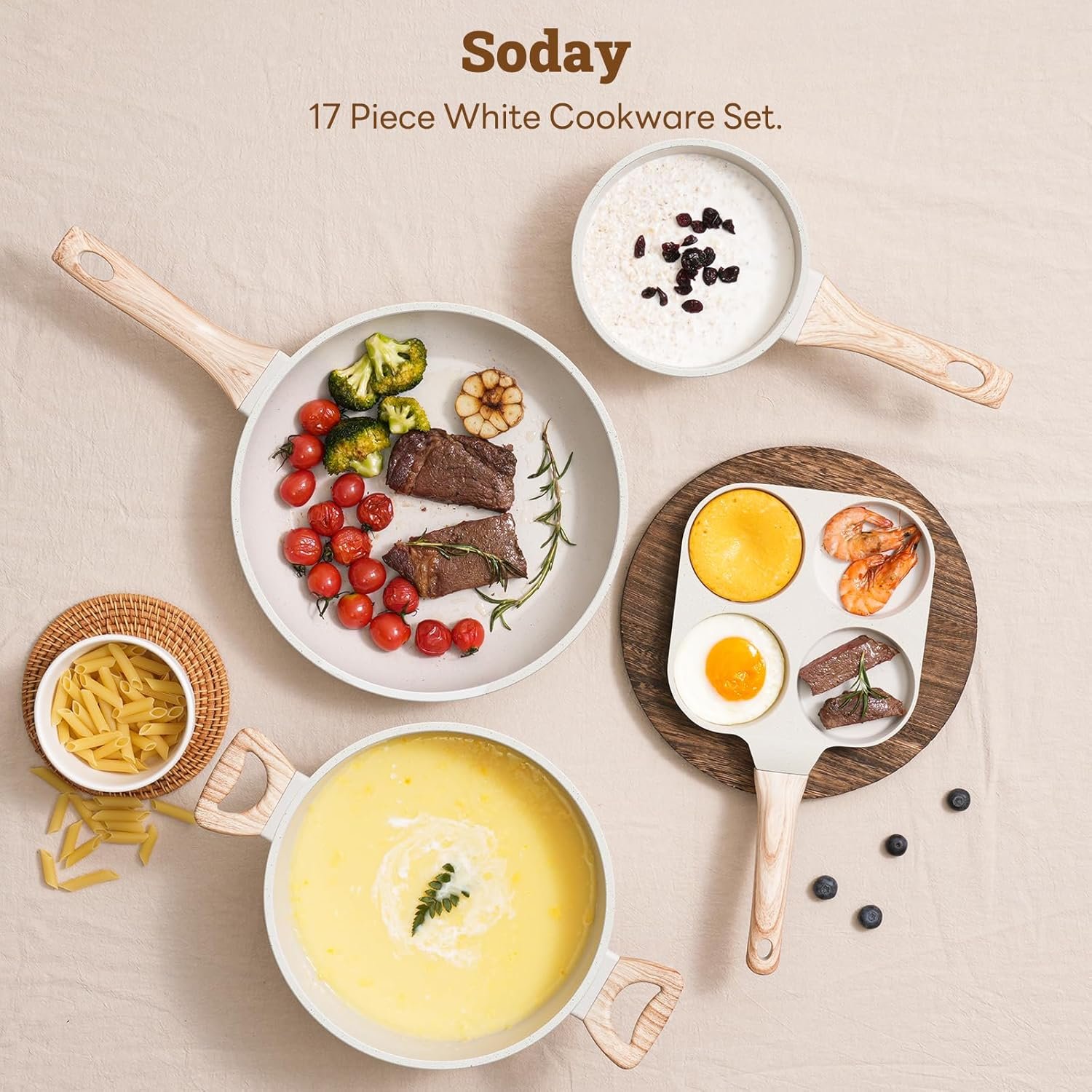 • Complete Cooking Solution: SODAY’s 17-piece kitchen cookware set includes a 9.5-inch/11-inch pan. 11-inch/4.3-quart sauté pan. 4-cup egg pan. 1.6-quart saucepan with lid. 4.5-quart saucepan with lid and steamer. as well as 4 Pan Protector with silicone Spatula 、 Spoon and Tong that are ideal for your everyday cooking.