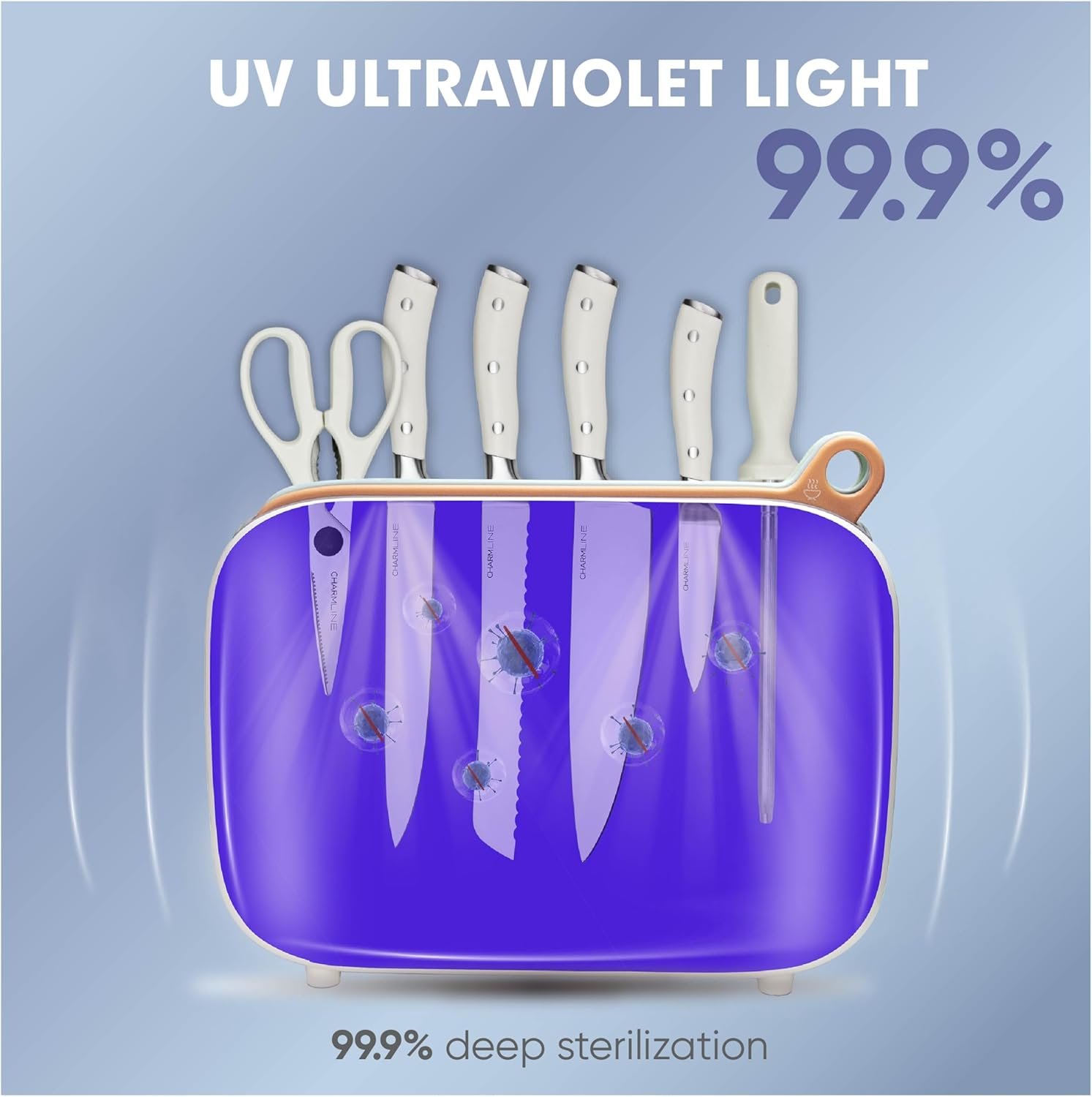 The set also includes four knives for various purposes, along with a pair of scissors and a sharpener. Everything you need for meal prep is right at your fingertips.