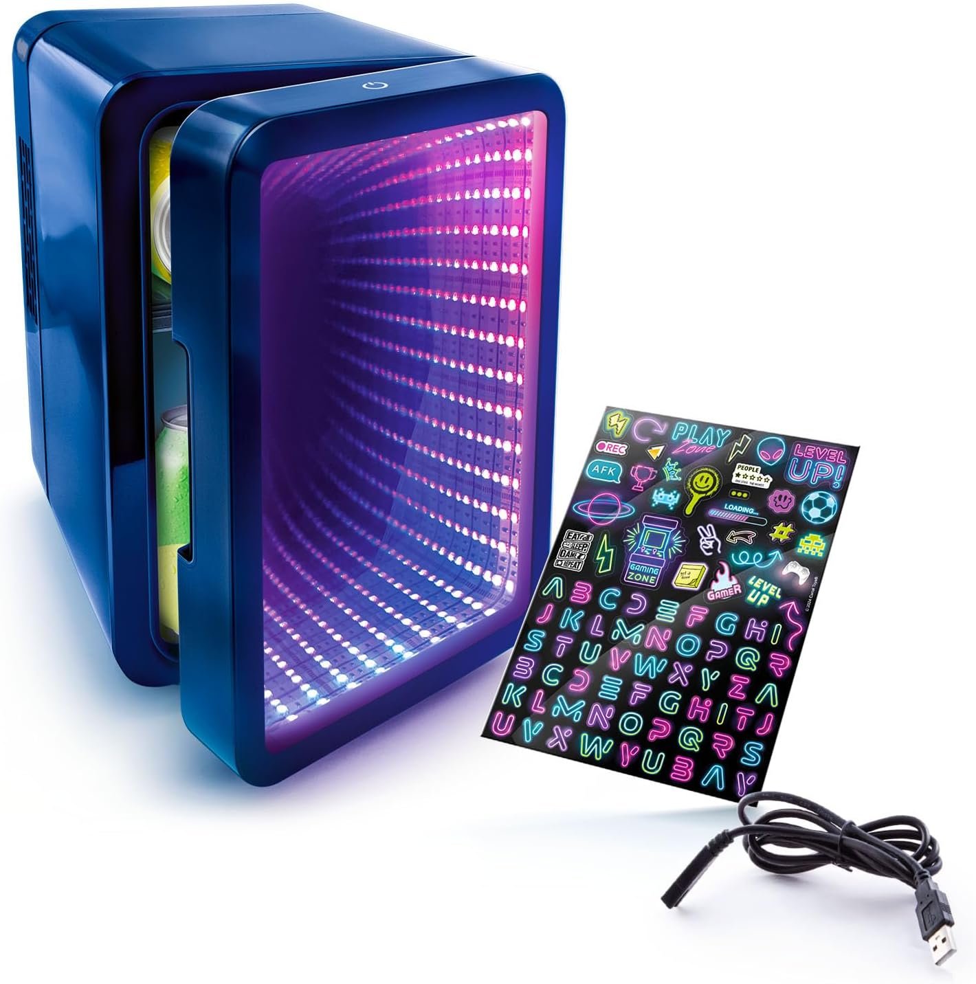 So Chill Mini Fridge Infinity Effect. Gamers. Students. Home/Car trips/Hangouts + More. USB Powered. Stickers Included. 4L/6 Cans. Mirror Infinity Effect Door