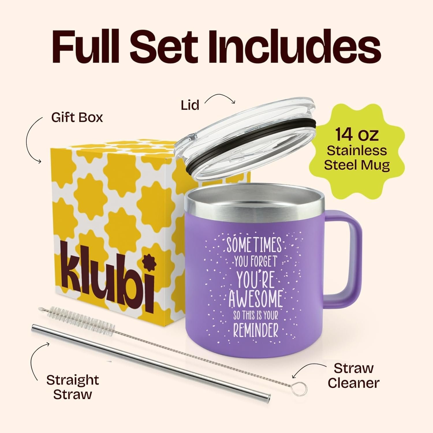 • EZ SLIDE LID – This last minute gifts for women purple coffee cup is featuring leak-resistant lid technology and BPA-free composition. Embrace hassle-free cleaning with its dishwasher-safe attribute. and enjoy the ergonomic design of our Sometimes You Forget You’re Awesome Tumbler With Handle that enhances your overall drinking experience.